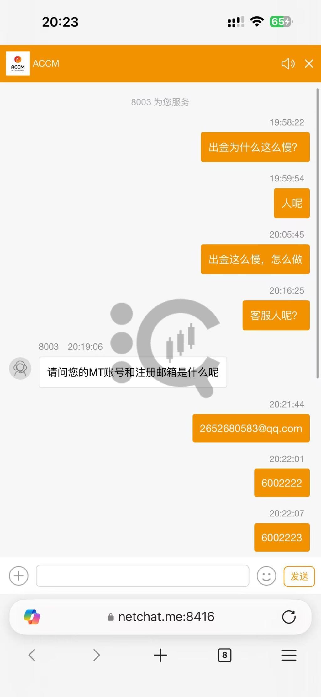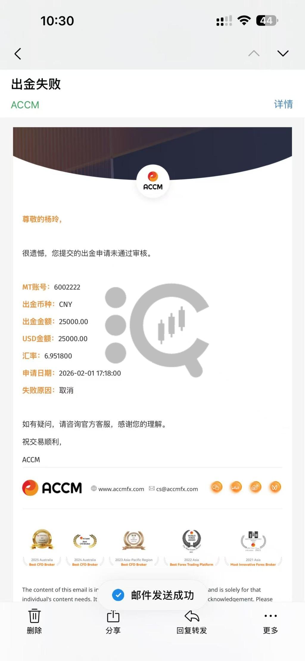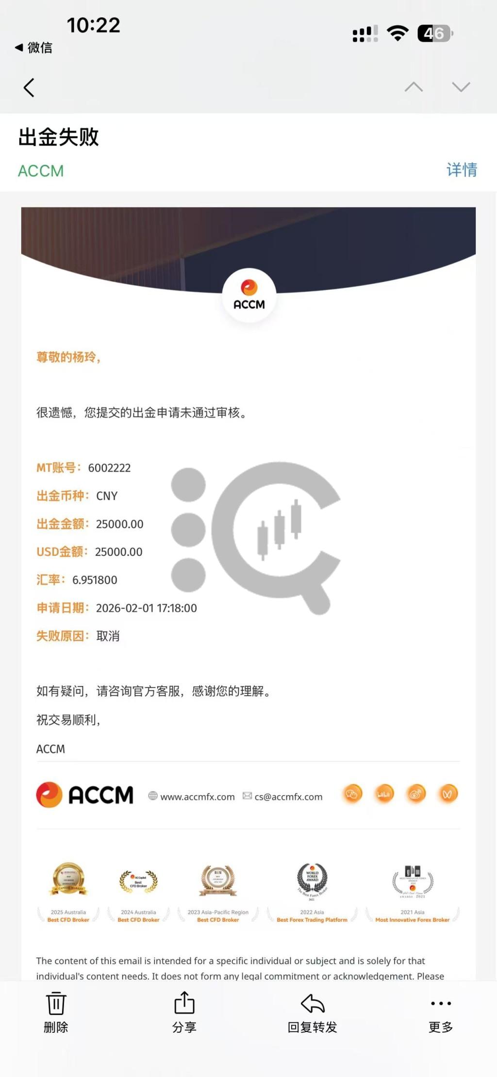 ACCM AC资本市场:诈骗市场,黑平台,盈利不给出金,损失57000美金,原理黑平台,滚出中国市场:在2026年2月1日出金25000美金,在2026年2月2日出金1000美金,平台一直不打bohui款,在2026年2月3日驳回打款,同时把账户上剩余的31000美金和驳回的资金全部清0,诈骗平台,黑平台